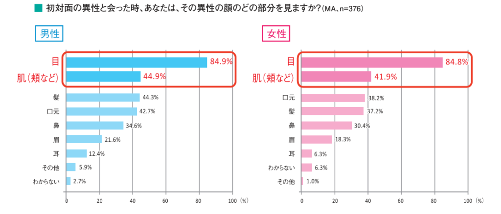 マンダムの調査によると、初対面の異性が最も注目するのは「顔」(8割以上) であり、特に 「目」に次いで「肌や」「口元)」が見られる ことが分かっています。